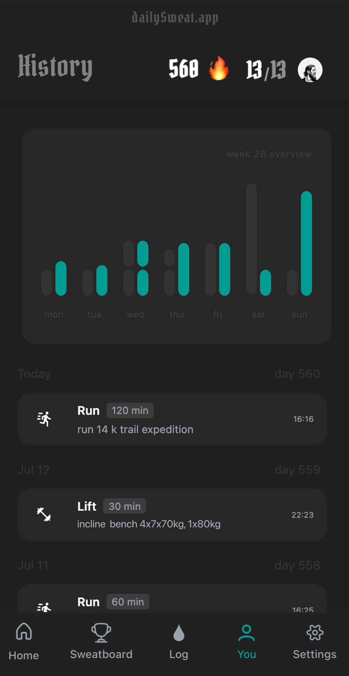 Scroll back, see the patterns, compare weeks and stay honest with yourself.